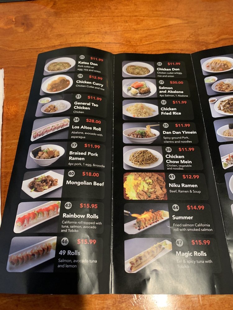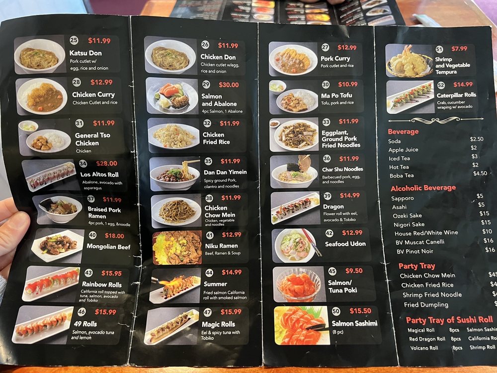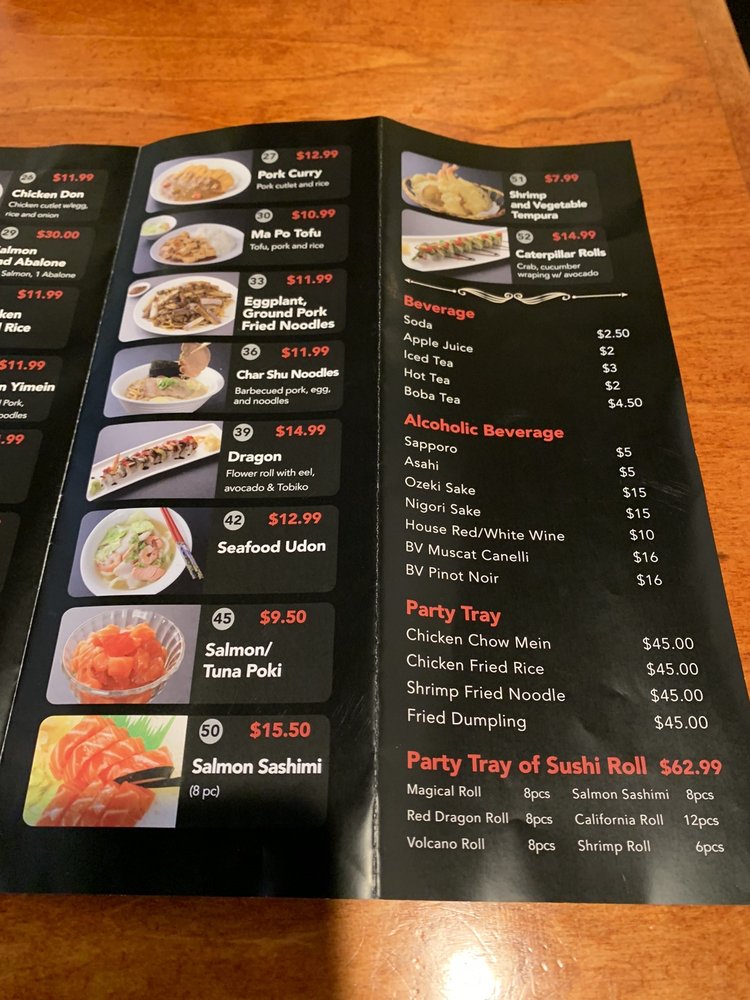 Magic roll (8 pieces), red dragon roll (8 pieces), volcano roll (8 pieces), salmon sashimi (8 pieces) and California roll (6 pieces).